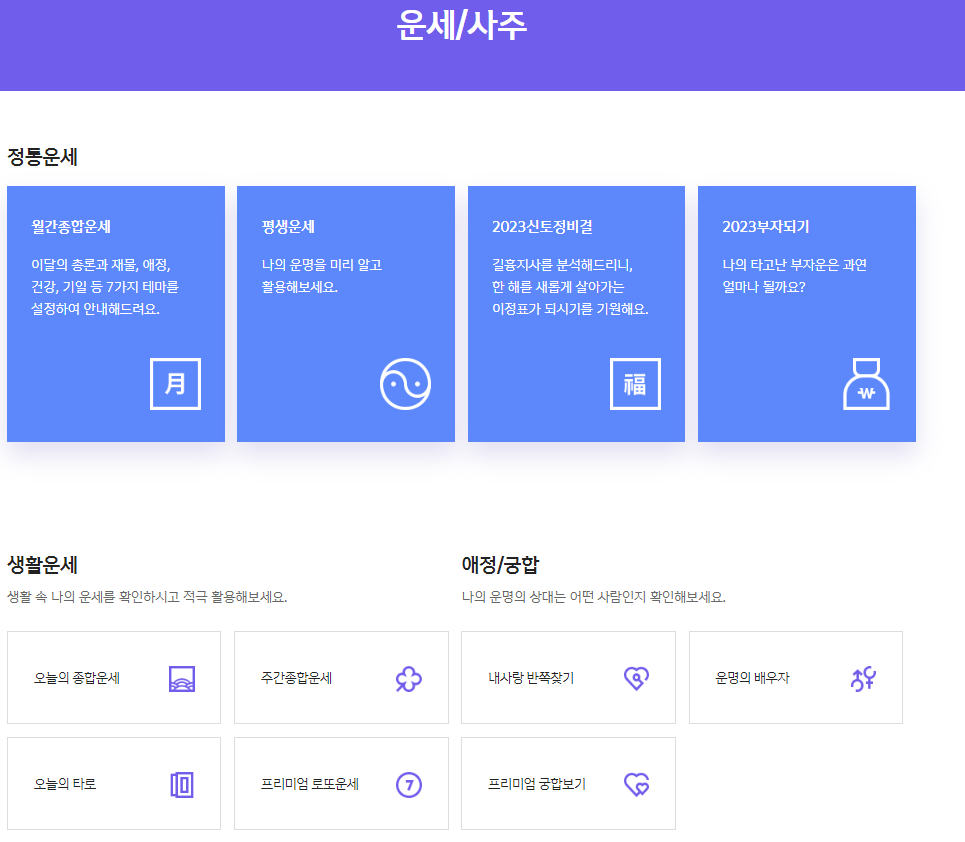 상단의 메뉴바에서 혜택 > 생활서비스 > 운세/사주를 클릭하시면 아래와 같이 정통운세, 생활운세, 애정/궁합 등의 서비스를 이용하실 수 있습니다. 참고로, 모바일에서 볼 경우에는 왼쪽의 메뉴 아이콘(가로줄 3개)을 누르면 바로 운세서비스 이용이 가능합니다.