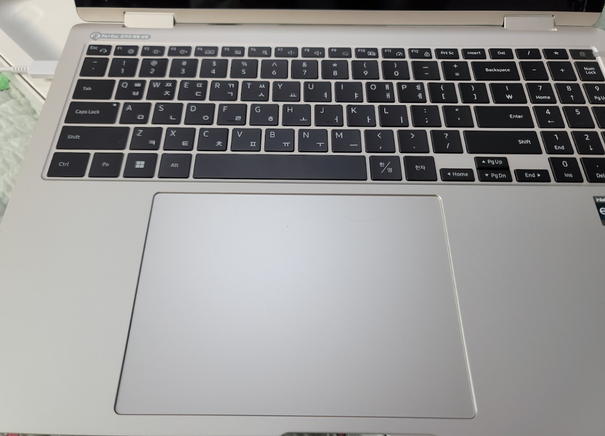 모니터를 반대 방향으로 접으면 뻑뻑한 느낌이 전혀 없이 부드럽게 뒤로 넘어간다. 그렇다고 노트북으로 사용할 때 힘없이 앞뒤로 움직이지도 않는다. 이 부분을 구매 전에 살짝 걱정했는데 힌지 부분이 잘 만들어진 것 같아 정말 맘에 든다.