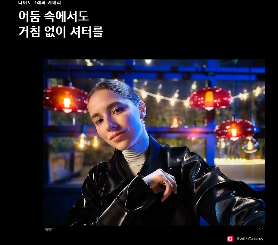 삼성 홈페이지에 보면 어두운 밤에도 선명한 사진을 찍을 수 있다고 설명되어 있다.